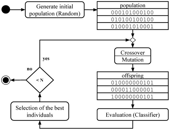 Evolutionary algorithms, inspired by natural evolution, are designed to optimize solutions. Among them, genetic algorithms (GAs) are particularly well-suited for feature selection (FS). These algorithms start with a population of individuals, each representing a possible solution. Through processes of selection, crossover, and mutation, successive generations evolve towards better solutions, until the number of generations specified by parameter N is reached (Figure 1). The following subsections describe the main aspects of the algorithm used in this work.