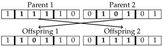 The crossover operation combines coded individuals to explore potentially better solutions. In this work, two-point crossover, a method widely used in GAs, is employed to generate the next generation within the population. This mechanism exchanges a segment of the genotypic vector between two parent individuals, bounded by two randomly selected points. Figure 2 illustrates this process. The probability of selecting segments of different sizes and their location within the genotype is uniform, ensuring a balanced exploration of the search space without introducing biases in the optimization.