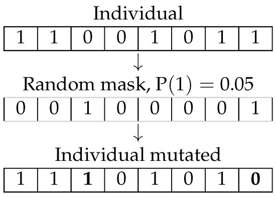 The mutation operation on encoded individuals introduces random modifications in the population to preserve genetic diversity. This mechanism is crucial for preventing premature convergence, allowing the algorithm to explore a broader search space and reducing the risk of getting trapped in local optima. In this study, the bit-flip mutation operator is employed, a widely used technique in binary-encoded GAs. This operator selectively alters certain binary values within the genotype of each individual, flipping them with a predefined probability, which serves as a control parameter for the mutation intensity. Figure 3 illustrates this process.