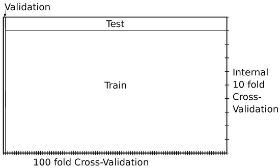 To evaluate the performance of the classification, the same internal cross-validation of ten partitions from grid search optimization was used in the original study. To obtain stable results, they repeated the experimentation 100 times. However, given that the number of combinations evaluated by grid search is in the order of the tens of thousands, overfitting is likely to occur, potentially leading to an overestimation of the expected accuracy. To address this issue, instead of repeating the experimentation 100 times, we utilized nested cross-validation with 100 folds. In this way, the results were expected to be similar in testing, as only a very small number of instances were omitted in each run, while providing a reliable estimate of the expected performance. The whole process was repeated 10 times to ensure a stable final validation result. This evaluation is illustrated in Figure 4.
