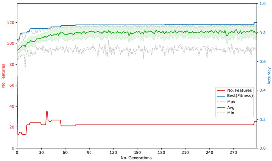 In the second phase of our study, the GA is used to perform feature selection and evaluate its impact on the different classifiers. As an example, the evolution process of one run of the GA is illustrated in Figure 5.
