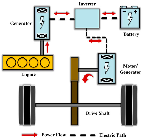 In this configuration, the electric motor alone provides the traction to drive the vehicle [62]. Because there is no mechanical coupling between the ICE and the drive axle, the ICE can function independently of the vehicle’s power demands and near its peak efficiency, thereby significantly reducing fuel consumption. Traction motors offer a broader operating range and greater efficiency compared to ICEs. Consequently, the transmission, essential in conventional vehicles, may not be required in a tandem HEV.