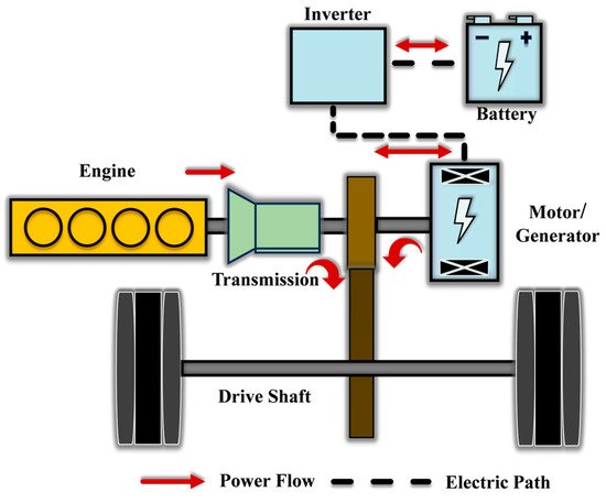 In parallel HEVs, the ICE and MG (Motor/Generator) are both directly connected to the output shaft to provide drive. The ICE connection is termed the mechanical path, while the MG connection is known as the electrical path [65]. Since the two power sources operate in different modes, parallel HEVs allow the electric motor and ICE to provide power to drive the vehicle in parallel, so the ICE and the electric motor can be driven separately or jointly, as illustrated in Figure 3. Under certain operational conditions, the vehicle can be operated by either the motor or the ICE alone when the battery’s state of charge is high. Some of the torque from the ICE will be redirected to turn the MG, which will be utilized as a generator to recharge the battery pack, in order to prolong the battery life when the SOC of the battery is at a lower level. In the state of charge, the drive power required for the exercise of the vehicle can only be provided by the ICE alone [66]. The MG functions as a generator during low power demand and as a motor during high power demand, keeping the ICE operating in the high-efficiency range and thereby reducing fuel consumption. Furthermore, parallel hybrids require transmissions to align high engine speeds with low vehicle speeds [44].