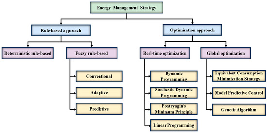 The control strategy’s primary objectives are to reduce hazardous emissions and fuel consumption while also maximizing vehicle performance to satisfy the driver’s need for power. To achieve the desired control objectives and consequently strike a balance between fuel economy and emission minimization, it is imperative to first comprehensively grasp the operational principles and unique traits of various power sources. Furthermore, a rational exploitation of the respective merits of these power sources, along with the implementation of effective control strategies, is crucial in achieving the desired outcomes. The optimal control algorithms of EMSs have been studied from a variety of angles by experts and scholars both domestically and internationally. Based on a substantial body of existing literature, this paper describes and summarizes the energy management issues of HEVs from a variety of angles. Zhang et al. (2020) [88] conducted a thorough evaluation, categorization, and comparative analysis of energy management techniques for HEVs, offering an insightful glimpse into the current standing of this research domain. HEV EMSs are categorized into two groups based on their various control methods: rule-based control strategies and optimization-based control strategies. Figure 5 illustrates this division.