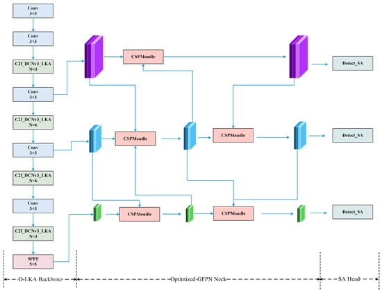 To address the challenge of road object detection in complex scenarios of autonomous driving, we propose the DGSS-YOLOv8s model. The model further optimizes the detection capability of irregularly shaped targets, occluded targets, and small targets based on YOLOv8s [18]. DGSS-YOLOv8s significantly improves the model’s performance in complex traffic scenarios by introducing three key modules, namely DCNv3_LKA_C2f, Optimized-GFPN, and Detect_SA, alongside a tailored loss function. Figure 1 illustrates the overall architecture of the DGSS-YOLOv8s model.