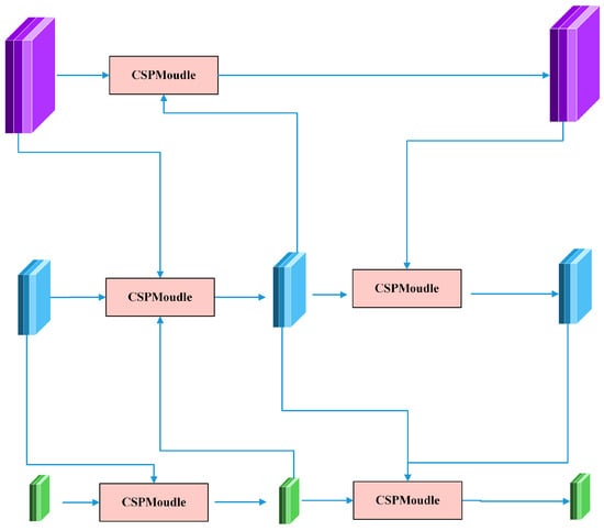 Feature pyramid networks (FPNs) [28] and their variants (e.g., PANet [31], BiFPN [32], GFPN [53,54], etc.), although successful in multi-scale feature fusion, still have obvious limitations in complex traffic scenarios. The unidirectional information flow of FPNs restricts the adequate fusion of high-level semantic and low-level spatial information; especially when dealing with both long-range and close-range targets, the detection accuracy of the model tends to decrease. For example, PANet solves the problem of unidirectional information flow by introducing bottom-up paths, but the complex structure increases the computational overhead and reduces the real-time performance of the model. BiFPN improves the information flow, but the computational cost is high, which makes it difficult to satisfy the demand for real-time detection. Although GFPN performs well in multi-scale feature processing, especially in small object detection and contextual information integration, it is accompanied by increased computational complexity and design complexity challenges. To prioritize high FPS while maintaining strong multi-scale fusion, we designed Optimized-GFPN. Inspired by efficiency-focused designs like BiFPN [32], our Optimized-GFPN modifies the standard YOLOv8s neck structure by removing specific upsampling layers identified as potentially redundant through experimentation, directly reducing the computational graph depth and latency. It is shown in Figure 3. Meanwhile, CSPModule (Cross-Stage Partial module) is introduced in Optimized-GFPN to replace traditional 3 × 3 convolutional feature fusion operations. Following the Cross-Stage Partial Network (CSPNet) principle [14], this splits feature channels, processing only a portion and then merging, aiming to reduce computation while enriching feature representation diversity. Combined with the reparameterization mechanism (Rep convolution) [55] and Efficient Layer Aggregation Network (ELAN) [56], this streamlined architecture enhances fusion efficiency and detection accuracy while contributing positively to the overall model FPS.