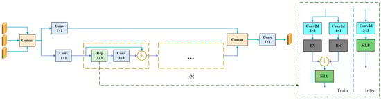 The structure of CSPmodule is shown in Figure 4. The CSPmodule reduces redundant computations and improves the diversity of feature representations by splitting the input feature map into two parts, one subjected to the convolution operation and the other kept unchanged, and then merging the two parts of the feature map. Meanwhile, the Rep convolution in this module can make the model different at training time and inference time to improve efficiency.