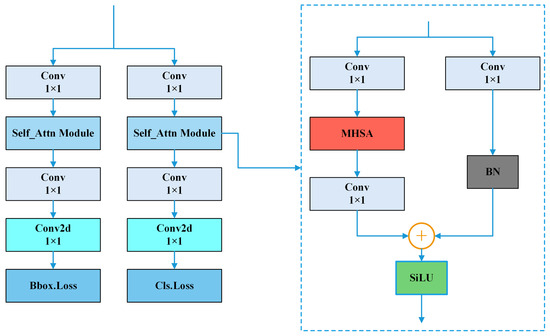 Traditional detection modules mainly rely on local feature extraction, making it difficult to comprehensively capture the global information in an image, limiting the performance of the model in complex scenes. Although the Transformer architecture [40] performs well in capturing global contextual information, its typical Self-Attention (SA) mechanism is often limited in practical applications due to its high computational complexity and memory consumption. Specifically, standard SA exhibits quadratic complexity () with respect to the number of input tokens (N) [40], requiring large memory () for attention maps, and the accompanying Feed-Forward Network (FFN) layers also contribute significantly to parameters and computation [57], hindering high-FPS applications on high-resolution inputs. These factors—quadratic computational cost, large memory footprint, and expensive FFN layers—are the primary limitations that Detect_SA aims to overcome for real-time applications. To address these limitations while still benefiting from global context modeling, we constructed the Detect_SA module by integrating the Memory-efficient Self-Attention module [58] in the detection header of YOLOv8s. Our Detect_SA implementation achieves efficiency by employing grouped query attention combined with a bottleneck structure using 1 × 1 convolutions to reduce channel dimensions before the SA computation and notably omitting the large FFN typical in Transformer blocks. Figure 5 illustrates the schematic structure of Detect_SA. The Memory-efficient Self-Attention module retains the global context-capturing capability of the Self-Attention layer while reducing the computational complexity and memory footprint by removing the FFN part and introducing 1 × 1 convolution [58]. Specifically, 1 × 1 convolution is used to reduce the number of input channels, making Self-Attention a bottleneck layer with smaller input/output channels, followed by restoring the channel dimensions through 1 × 1 convolution. To further enhance the expressive power of the model, the module also contains an additional bypass 1 × 1 convolution for retaining the uncompressed residual information.