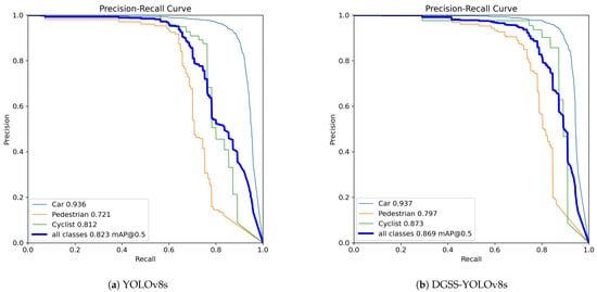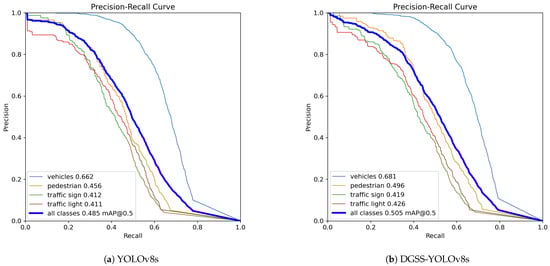 Figure 6 and Figure 7 present comparative precision–recall (P-R) evaluations across BDD100K and KITTI datasets, visualizing per-class detection characteristics at mAP@50 thresholds for both baseline YOLOv8s and our enhanced DGSS-YOLOv8s. Visually, the P-R curves for DGSS-YOLOv8s consistently demonstrate a better precision–recall trade-off, positioned generally higher and further to the right compared to the baseline curves across both datasets, indicating improved performance across various operating points. On BDD100K (Figure 6), while performance varies across classes, the most notable visual improvement is seen for the ’Pedestrian’ category, where the curve for DGSS-YOLOv8s (see Figure 6b) is significantly elevated compared to YOLOv8s (see Figure 6a), visually underscoring the enhanced capability to reliably detect this challenging category while maintaining precision. On the KITTI dataset (Figure 7), this trend is even more pronounced for both ’Pedestrian’ and ’Cyclist’, with their P-R curves for DGSS-YOLOv8s (see Figure 7b) showing substantial upward shifts over the baseline (see Figure 7a), visually confirming enhanced detection reliability for these vulnerable road users.