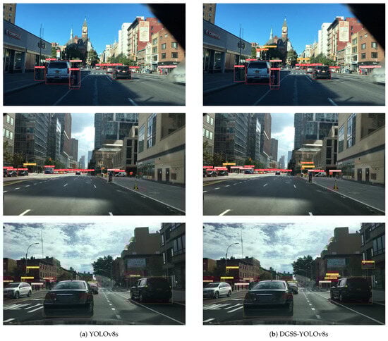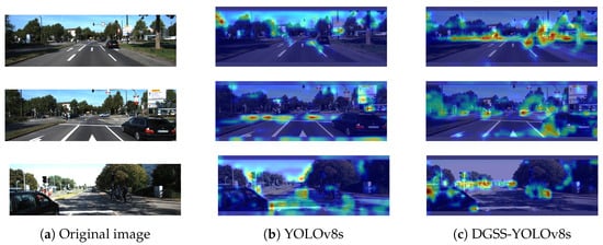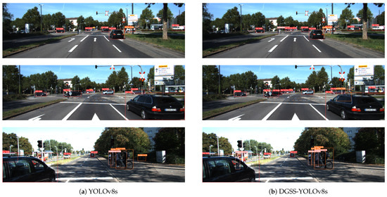 Figure 9. Detection results of YOLOv8s and DGSS-YOLOv8s on KITTI outputs. - Grad-CAM Results: We utilized Grad-CAM [67] to visualize CNN decision-making mechanisms, enabling the distinguishing and pinpointing of critical image regions influencing prediction outcomes. This technique constructs coarse localization maps by analyzing gradient propagation from the final convolutional layer to object-related concepts. As demonstrated in Figure 10 and Figure 11, comparative analysis reveals DGSS-YOLOv8s’ superior attention allocation compared to the baseline model. Visualization outcomes distinctly indicate YOLOv8s’ inadequate focus on traffic elements, whereas our enhanced architecture exhibits optimized feature concentration—effectively reducing boundary ambiguities, emphasizing target-centric characteristics, and filtering irrelevant background data. Notably, in occlusion-intensive scenarios, the modified framework demonstrates improved detection consistency through better spatial reasoning. For small object detection tasks, DGSS-YOLOv8s successfully identifies and amplifies discriminative features, achieving precise characteristic extraction that translates to measurable accuracy improvements in complex traffic environments.
