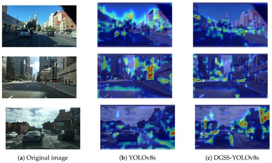 To further quantify the effectiveness of the proposed method, the results for per-class metrics are presented in Table 4 and Table 5. Table 4 shows that, in the BDD100K dataset, DGSS-YOLOv8s improves mAP@50 and mAP@50:95 across all categories by 2.0% and 1.2%, respectively. Specifically, the mAP@50 for the ‘vehicle’ class increased from 66.2% to 68.1%, while the mAP@50 for the ‘traffic sign’ and ‘traffic light’ classes increased by 0.7% and 1.5%, respectively. For the ‘pedestrian’ class, mAP@50 increased from 45.6% to 49.6%.
