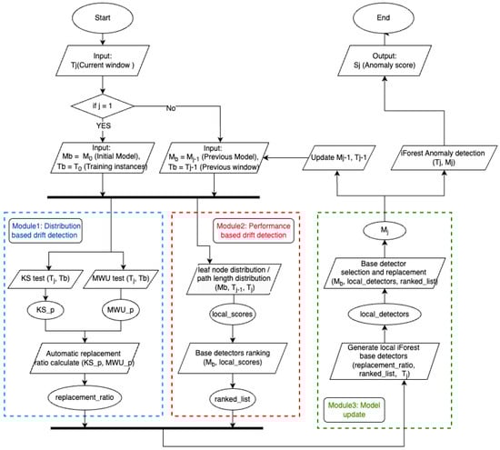 - Module 2: Performance-based Drift Detection. In the performance-based drift detection module, the internal structure of the iForest model is monitored to rank the base detectors according to their replacement priorities. Concept drift will have an impact on the result decision path of the tree structure in Isolation Forest. Analyzing path length deviation will give a very good indication of model performance degradation. Therefore, the framework provides a structure-based detector ranking without requiring additional model training during drift detection.