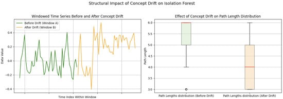 Structural impact of concept drift on Isolation Forest. (Left) time series segments before and after the concept drift. (Right) Path length distributions before and after concept drift. Colored boxes represent distributions for Window A and Window B, with red lines indicating the medians. A clear shift is observed, reflecting detector misalignment.