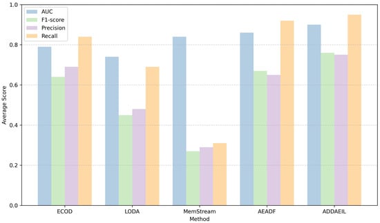 The average results of all baselines over all datasets are reported in the last row in Table 2 and summarized in Figure 4. As expected, ADDAEIL obtains the highest F1-score of 0.76 and outperforms the next best baseline AEADF, which achieves 0.67. ADDAEIL also reaches the highest average precision of 0.75 and the highest AUC of 0.90. These results indicate that ADDAEIL can adapt to various forms of drift while maintaining strong window-level detection accuracy for both non-stationary and relatively stationary data streams. The hybrid drift detection enables ADDAEIL to combine the strengths of distribution-based and structure-based approaches, while its performance evaluation and proportional updating help avoid unnecessary model changes when no drift is present.