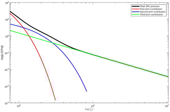 Contributions of JWL terms to the total pressure; the black line is the total pressure given by the JWL Equation (28); the red line is the contribution from , the blue line is the contribution from , and green line is the contribution from .