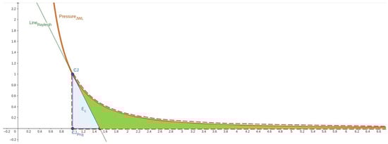 The plot shows how to compute the detonation energy from the JWL curve and the Rayleigh line. The areas under the isentropic curve fitted by the JWL product EoS and the Rayleigh line, in fact, represent the work in the plane. The energy of compression given by the shock wave passage is represented by the triangular area under the Rayleigh line (blue); the chemical energy released is represented by the dashed red area under the JWL curve; , hence, is the difference (green) between the 2 areas.