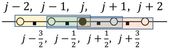 The high-order numerical schemes focus on the spatial discretization on the right-hand side of Equation (1), utilizing the discrete grid points (evenly distributed) in Figure 1. The normal grid points are marked as circles with integer indices (j − 2, j − 1, j, j + 1, j + 2), while the indices for the midpoints are j − 3/2, j − 1/2, j + 1/2, and j + 3/2, respectively.