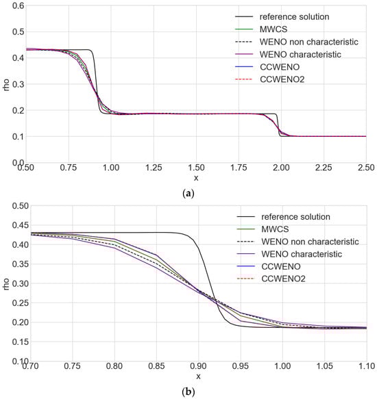In order to solve the instability problem of WCS, the modified weighted compact format (MWCS) [] combines the results of WENO and WCS with a certain weight, but there is still an instability problem when dealing with sharp shock waves. In addition, since the pentadiagonal linear system needs to be solved additionally, this improvement also doubles the computational workload.