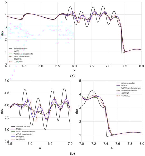 Numerical results of the Shu–Osher problem: (a) whole domain; (b) enlarged view.