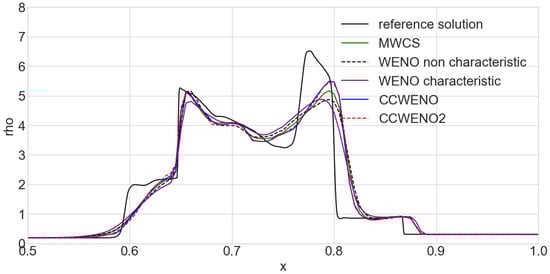 Figure 4 illustrates the numerical results obtained for the challenging two interacting blast waves problem, which involves both complex wave systems and strong discontinuities. In all the tested numerical schemes, the grid size remains at 200 points, and the time step size is also kept as , as in the previous benchmark cases. The refined numerical solution for comparison is still obtained through WENO scheme with 1600 points, and is to be reduced to .
