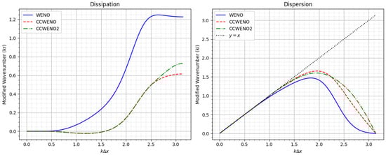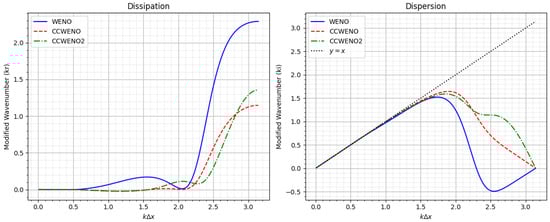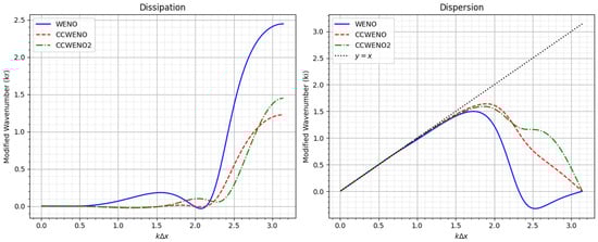 Figure 5 illustrates the dissipation (left) and dispersion (phase error, right) characteristics of the WENO scheme compared to the CCWENO and CCWENO2 schemes (positive flux) within a sufficiently smooth region ( and are used for the weights). The results clearly demonstrate that the dissipation produced by the CCWENO and CCWENO2 schemes is significantly lower than that of the WENO scheme, highlighting their improved ability to preserve energy and accuracy in smooth flows. Furthermore, the dispersion (phase error) is also notably reduced, as evidenced by the closer alignment of the curves to the ideal reference line (), indicating better phase accuracy and reduced numerical distortion.