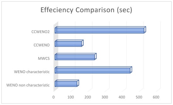 Figure 8 presents a detailed comparison of the running times (in seconds) for five schemes in solving the two interacting blast waves problem: the original WENO scheme, WENO with characteristic-wise reconstruction, the MWCS, and the proposed CCWENO and CCWENO2 schemes. The computations were executed on the same personal computer equipped with an AMD Ryzen 7 5700U processor, ensuring reliable performance metrics.