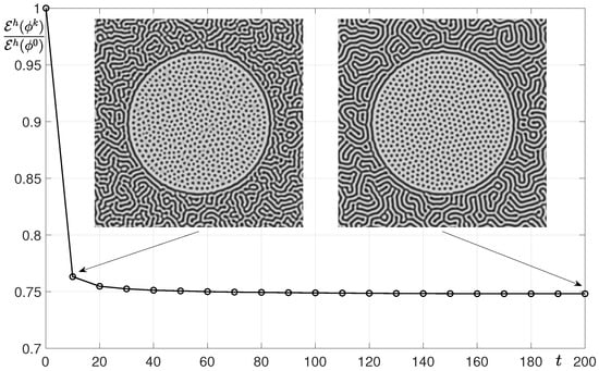 Figure 3 shows the phase separation behaviors during evolution and illustrates the time evolution of the phase field governed by the nonlocal CH equation under a distinct annular initial configuration. The initial condition introduces a negative average phase value only in a ring-shaped region between two concentric circles. At the early stage, the phase field would exhibit a largely homogeneous pattern outside the ring, while fine-grained oscillatory structures emerge within the annular region. These features stem from the imposed random perturbation and the localized nonzero mean in the initial configuration. As time progresses (, the left snapshot in the Figure 3), the internal structure within the ring undergoes coarsening and results in a hexagonal dot pattern, whereas stripe-like morphologies appear in the surrounding region. This contrast in the evolved patterns reflects the effect of the spatial variation in the initial average phase distribution. Eventually, in the late stage (, the right snapshot in the Figure 3), a well-organized pattern with a hexagonal dot structure appears inside the annular region, while elongated lamellae with clearly defined interfaces emerge in the other regions. These results demonstrate that spatially selective initial perturbations can effectively localize phase separation and pattern formation. This localization induces different morphological evolution within diblock copolymer systems that are described by the nonlocal CH equation. Figure 3 also shows the time evolution of the normalized discrete total energy . The normalized discrete total energy initially decreases over time and gradually stabilizes afterward.