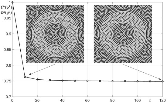 where is obtained by solving . Figure 2 also shows the time evolution of the normalized discrete total energy . The normalized discrete total energy initially decreases over time and gradually stabilizes afterward.