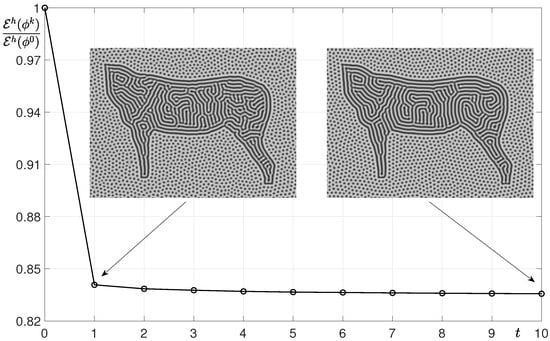 Figure 4 describes the phase separation behaviors over time and illustrates the temporal evolution of phase separation governed by the nonlocal CH equation with an initial condition shaped like a zebra. In this setup, the phase variable is initialized to random values with an average within the zebra-shaped domain , while the region outside the shape is set to random values with an average . Initially, a disordered mixture of short stripe and dot-like patterns would emerge within the zebra-shaped region. The interfaces are irregular and the pattern has not yet coarsened significantly. As time progresses to (the left snapshot in the Figure 4), the internal structure becomes more organized, with the appearance of elongated stripe-like morphologies that begin to align spatially. The boundaries of the zebra remain sharply defined, which indicates that the pattern formation is effectively confined to the initial domain. Finally, at 10,000Δt (the right snapshot in the Figure 4), the internal morphology reaches a relatively steady configuration, characterized by well-developed and continuous stripe patterns with smooth interfaces. The zebra shape remains intact, and no significant evolution is observed in the outer region, which confirms that the spatially selective initialization effectively localizes the dynamic behavior of the system. These results demonstrate how complex morphological patterns, such as those resembling natural textures, can emerge and stabilize within geometrically constrained domains when driven by nonlocal interactions in the phase-field model. Figure 4 also shows the time evolution of the normalized discrete total energy . The normalized discrete total energy initially decreases over time and gradually stabilizes afterward.