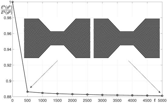 Figure 5 describes the phase separation behaviors over time. At the early stage, horizontal and continuous stripe structures would begin to appear along the edge regions inside the tapered trench, while the non-edge regions exhibit disordered short stripe structures. As the system evolves to (the left snapshot in the Figure 5), the number of horizontal and continuous stripe structures increases along the edge regions of the trench interior, and elongated stripe patterns with partial spatial alignment emerge in the non-edge regions. By (the right snapshot in the Figure 5), the central area of the trench is fully characterized by horizontal and continuous stripe structures, the edge regions inside the trench show a further increase in such patterns, and the non-edge regions exhibit enhanced connectivity and smoother interfaces. Figure 5 also shows the time evolution of the normalized discrete total energy . The normalized discrete total energy initially decreases over time and gradually stabilizes afterward.