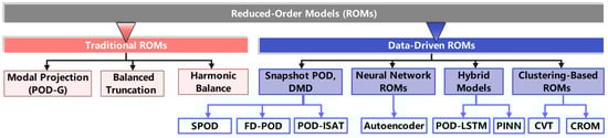 To overcome these limitations, a wide range of model reduction strategies—broadly referred to as reduced-order models (ROMs) [,]—have been used to construct low-dimensional representations that capture dominant flow features. The fundamental strength of such approaches lies in establishing a robust mapping between high-dimensional dynamical systems and their low-dimensional surrogates—a task that involves not only compressing data but also uncovering the essential physical mechanisms underlying fluid motion.