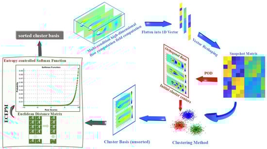 Building on these foundations, clustering-based dimensionality reduction methods have shown increasing promise. Burkardt et al. [] proposed a CVT-based approach but did not address mode importance. Iqbal et al. [] introduced modified pole clustering for improved initialization, with emphasis on clustering rather than reduction. Huera-Huarte and D’Adamo [,] combined clustering and POD to analyze vortex dynamics, yet lacked an effective mode-ranking strategy. Wei et al. [] presented CROM, which models transitions via a Markov matrix, but its dimensionality and sparsity hinder application to complex systems.