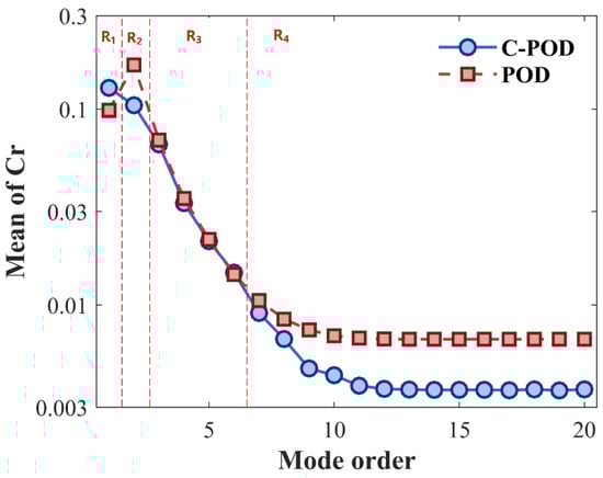 To evaluate the performance of the POD and C-POD methods, we conducted order reduction on the dataset and reconstructed the original data using various modal orders. The correlation coefficient and root mean square error (RMSE) were employed as evaluation metrics. While these two indicators, respectively, capture different aspects of reconstruction quality—trend similarity and numerical deviation—their combined use is not only less intuitive but also somewhat cumbersome in comparative analysis. Therefore, we introduced a new metric, Cr, defined in Equation (22), which integrates both correlation and error information to provide a more concise and comprehensive assessment of model performance: