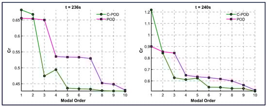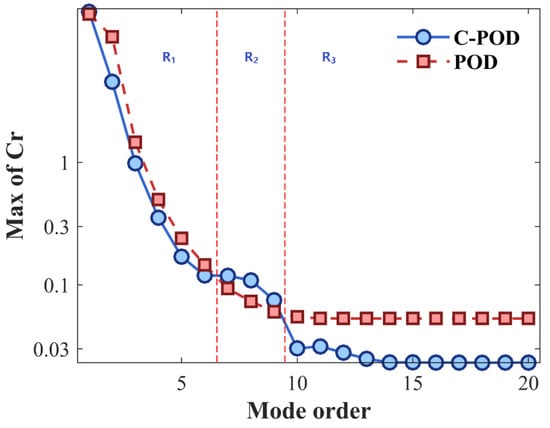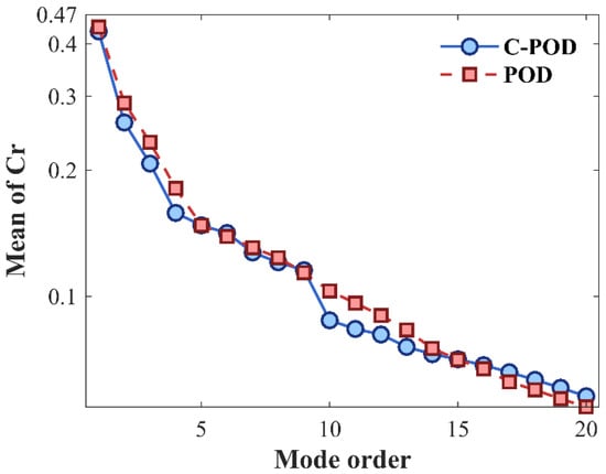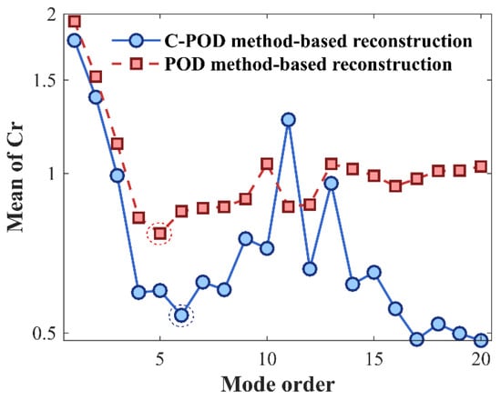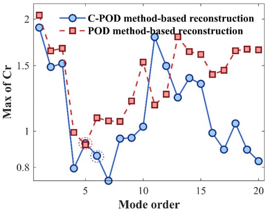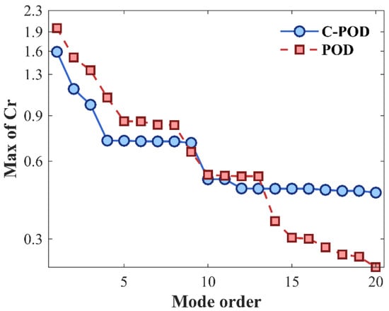 Under varying levels of modal truncation, the datasets were reduced using both the POD and C-POD methods. The resulting modal coefficients and orthogonal bases were then employed to reconstruct the original datasets. Figure 4 and Figure 5 present the average and maximum values of Cr, computed using Equation (22). The average Cr value reflects the overall reduction capability, while the maximum value indicates the lower bound of this capability. As illustrated in Figure 4, both methods exhibited enhanced reduction performance with increasing modal truncation, stabilizing at higher modal orders. For modal orders below 6, the reduction capabilities of the two methods were comparable; however, for order values above this threshold, the C-POD method significantly outperformed POD. Figure 4 further shows that, regarding the lower bound of reduction capabilities, C-POD was superior at modal orders 7, 8, and 9, whereas POD maintained an advantage at other modal orders. These findings preliminarily highlight the superior reduction accuracy of the C-POD method.