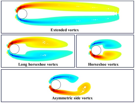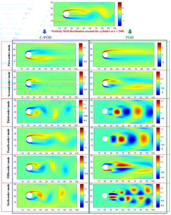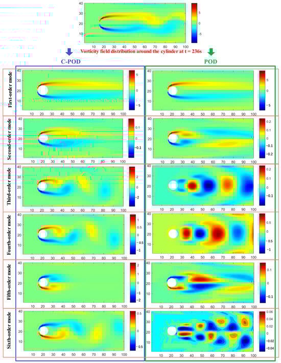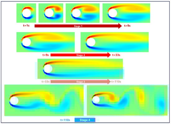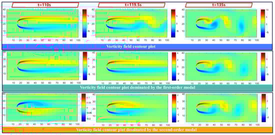 This indicates that C-POD’s time-varying modal coefficients effectively captured both dominant state transitions and subtle flow variations in the cylinder wake. The evolution of vorticity fields dominated by the first and second modes is illustrated at key time points: as shown in Figure 17, Figure 18 and Figure 19, the time-resolved vorticity structures reflected the dynamic flow features governed by these leading modes.