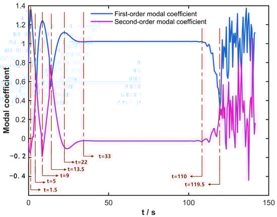 Temporal variation of the first and second modal coefficients extracted by the C-POD method using the ECEPM method.