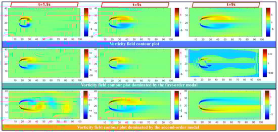 Temporal changes in the vorticity field dominated by the first and second modes of the C-POD method at t = 1.5, 5, and 9 s.