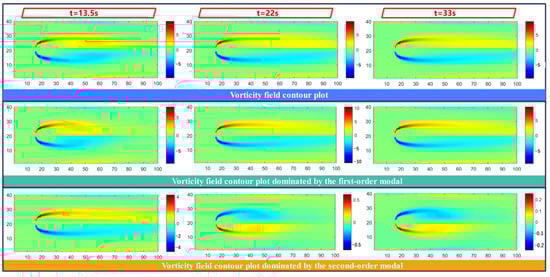 Temporal changes in the vorticity field dominated by the first and second modes of the C-POD method at t = 13.5, 22, and 33 s.