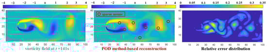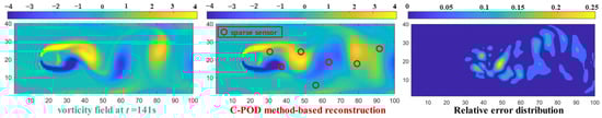 Based on the above analysis, a modal order of 5 was chosen for the Gappy POD method and a modal order of 6 for the Gappy C-POD method. The reconstruction of the cylinder wake vorticity field at t = 141 s is shown in Figure 22 and Figure 23. From left to right, the three images in Figure 22 and Figure 23 represent the cylinder wake vorticity field at t = 141 s, the reconstructed field with sparse sensor layout, and the distribution of reconstruction relative error. From Figure 21 and Figure 22, it can be seen that the maximum error in the field reconstruction using the Gappy C-POD method was 25%, which is smaller than the maximum error of 35% in the field reconstruction using the Gappy POD method.