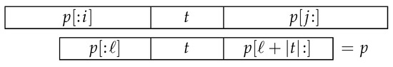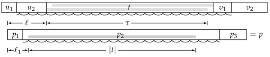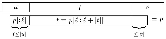 Now suppose that there are at least two occurrences of t in p. Let us consider some occurrence of p in (of course one that starts within u and ends within v); the string t in matches one of the occurrences of t in p; let ℓ be the position where this occurrence of t in p begins (Figure 4). There are at most characters to the left of this occurrence of t in p (otherwise p would already extend beyond the left edge of ), and there are at most characters to the right of it (otherwise p would extend beyond the right edge of ). Therefore, no other occurrence of t in p can begin more than characters to the left of ℓ or more than characters to the right of ℓ. If another occurrence of t in p begins at position , then .