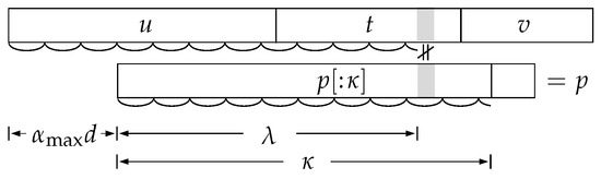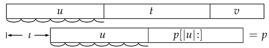 Similarly, in , let us see how far into u and v the middle part of t could be extended while maintaining periodicity with period d. This requires some caution: t starts with the beginning of the period, so when we extend the middle part from the right end of u leftwards, we must expect the end of the period at the right end of u. So we must compute the longest common suffix of u and something that ends with the end of t’s period, which is not necessarily t itself because its length is not necessarily a multiple of the period length. A similar consideration applies to extending the middle part from the left end of v rightwards. Let be the length of what remains of t if we restrict ourselves only to periods that occur in their entirety. Since , it follows that , so is longer than and . If we now find the longest common suffix of the strings u and and the longest common prefix of the strings v and , we will receive what we are looking for, and we do not have to worry about running out of t before u or v. From now on, let us imagine in the form , where is periodic with a period of length d. Figure 5 shows the resulting partition of the strings and p.