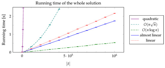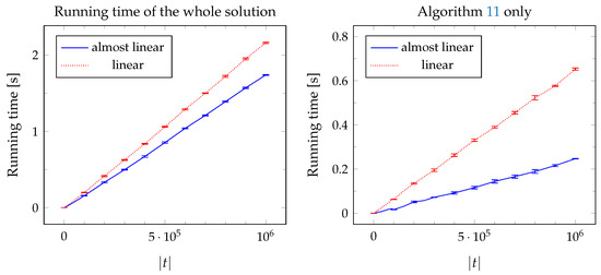 In Figure 7, we compare the performance of the almost-linear solution (using a disjoint-set forest in Algorithm 11) with the truly linear solution (which uses the static tree set union data structure instead). We show the results for different sizes of the inserted string t, with the other two strings being proportionally longer: , . Both solutions exhibit linear behavior (as expected, considering that the non-linear term in the complexity of the almost-linear solution is the very slowly growing inverse Ackermann’s function) but the almost-linear solution turns out to be faster in practice: with the almost-linear instead of the linear implementation of union-find, Algorithm 11 runs approximately 2.8 times faster and the solution as a whole (of which Algorithm 11 is only a small part) runs approx. 25 % faster. Note that we did not optimize the implementation for speed as we are interested in its asymptotic properties, therefore this comparison might not reflect the true potential of each method (for example, Gabow and Tarjan ([19], p. 249) reported that in some of their experiments, the running time of their static tree set union data structure was only 0.6–0.7 times as long as that of the disjont-set forests). In the remainder of this section, we will report the results of the linear solution.