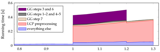 The relative amount of time spent on different parts of the solution remains fairly stable as the length of the pattern p varies (while the strings s and t are kept constant); this is illustrated by the stacked area chart on Figure 8. Major changes only occur when certain parts of the solution can be skipped altogether. For , no part of Algorithm 8 needs to be executed and only the “everything else” category remains. For , steps 1–6 of Algorithm 8 do not need to be executed, which also means we do not have to initialize the union-find data structure; we still need to preprocess p to support constant-time LCP queries, however, since these are needed in step 7.