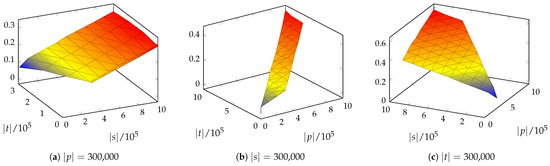 The size of the input to our algorithm is defined by three variables—the lengths of the strings p, s, and t. We can show the behavior of the algorithm by fixing one variable to a reasonable value and observing the 3D chart of the running time as a function of the other two variables. In Figure 9, we can observe approximately plane-shaped charts, demonstrating that the running time is linear in the lengths of the input strings.