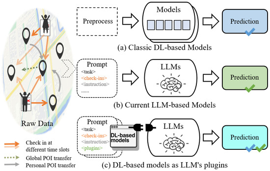 In addition to early methods [4], existing mainstream classic models based on deep learning mainly have two directions. Firstly, sequence-based approaches are harnessed for trajectory modeling. Secondly, graph-based methods for learning complex relations. Moreover, a handful of recent studies [5,6] have begun to shift their focus to mining time information to capture time slot preferences. Some studies [6,7] have further introduced target time to provide users with recommendations for specific time slots, which better meet their daily needs. Recently, LLMs have attracted significant attention. Existing research [8,9,10] has proven that LLMs can acquire and represent spatiotemporal knowledge from training corpora, as well as exhibit strong capabilities for time series prediction, thus laying a theoretical foundation for the next POI recommendation. Wang et al. [11] have made preliminary attempts. They primarily rely on users’ check-in history records to execute zero-shot prompting. Based on extensive common sense [12,13], LLMs can perform robust predictions even for cold-start users. Moreover, LLMs can provide corresponding explanations while predicting, thus addressing the issue of poor interpretability in classic DL-based methods [14].