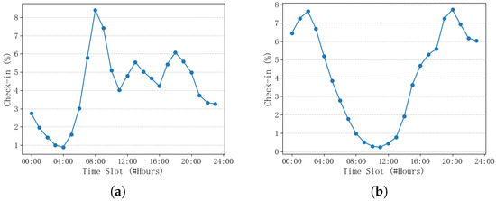 In order to explore the rationality of the POI recommendation in mining time slot patterns and POI transfer relationships, we performed data analysis based on the NYC dataset from the Foursquare platform and the CA dataset from the Gowalla platform. Firstly, we investigated the activity of user check-in behavior under different check-in periods. Dividing the data into 24 groups based on user check-in times in UTC, we calculated the check-in proportion for each time slot. As shown in Figure 2, the changes in check-in activity across different time slots are evident in both the NYC and CA datasets. Obviously, the frequency of check-in behavior is closely related to the users’ daily routines.