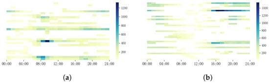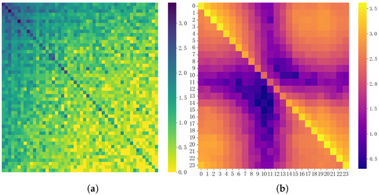 Finally, we analyze the potential transfer patterns of successive check-in pairs. Specifically, on the one hand, we select the 50 most frequent POIs from the NYC dataset and analyze their transfer heat values, as shown in Figure 4a, where the heat values are the results of a logarithmic transformation using . We can draw the following two conclusions: First, the heat values along the main diagonal are significantly higher compared to the surrounding heat values, indicating that users generally exhibit a pronounced tendency for repeated check-ins. Second, the transfer preferences for POIs are not uniformly distributed, but show a higher preference for certain types of POIs or specific POIs. On the other hand, we analyze the temporal relationship between two successive check-ins, as shown in Figure 4b. It can be clearly observed that the heat values near the main diagonal are relatively higher, meaning that the transfer heat values for POIs in similar time slots are higher. Furthermore, the transfer heat values are generally lower or higher during specific time slots, for example, showing lower transfer heat values between time slot 9 and time slot 12.