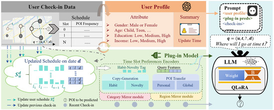 Recently, some studies [11,31,32] have begun to explore novel LLM-based frameworks, which offer advantages that are difficult to match with classic DL-based methods. In particular, an LLM-based model also easily utilizes target time information as context and provides recommendation reasons, enabling more user-friendly recommendations, such as [11]. Specifically, LLMMob [11] leverages individual users’ check-in data and target check-in times to perform the next POI recommendation using zero-shot prompting. LLM-ZS [31], a simplified version of LLMMob, delves into the effects of zero-shot, one-shot, and few-shot prompting. LLMMove [14] further integrates geographical information of POIs. However, simple prompt engineering methods have limitations in effectively extracting fine-grained user preferences. LLM4POI [33], which is based on fine-tuning large language models, identifies states similar to the current trajectory from historical data by computing trajectory similarity. However, this approach requires substantial training data and computational resources. In contrast, GenUP [32] saves significant computational resources by periodically updating user profiles instead of frequently computing trajectory similarity.