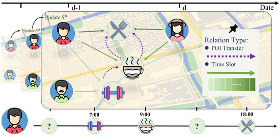 Since TKG emphasizes the importance of temporal information, it serves as the foundation for capturing dynamic temporal patterns effectively. Additionally, its extrapolation tasks align well with POI recommendations, and extracting specific quadruple structures is particularly well-suited for recommendation scenarios in specific time slots. Therefore, we incorporate TKG and utilize its reasoning model as a crucial component of our work. Concretely, a day is divided into time slots. Then all check-in records are generated into corresponding fact quads based on their time information and divided into different snapshots by date d. Each represents a TKG snapshot on the date, d, with all check-ins within a snapshot occurring on the same date, d. The time slot relation t represents the relationship of checking in at a specific time slot within a day, as shown in Figure 6. We formulate a schedule based on our TKG to depict users’ daily check-in patterns. First, we calculate the frequency of check-ins at all POIs within each time slot for each user and update these frequencies for each date. Then, we construct the schedule matrix for each user, u, by