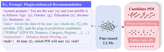 Subsequently, the LLM can conduct in-depth reasoning based on the given data and follow the instructions at the prompt. Specifically, first, we combine the previous check-in location to calculate the distance of the candidate POIs from the preliminary predictions. By evaluating the time gap between successive check-ins, we eliminate candidates with insufficient time feasibility, narrowing the analysis scope and enhancing prediction accuracy. Second, the plugin model’s preliminary predictions for categories and regions serve as auxiliary information for POI prediction. Then, the LLM conducts an in-depth analysis of user behavior patterns using the user profile, integrating context information and preliminary predictions from plugin models. Through multi-dimensional evaluation—such as whether the user has checked in at the POI before, whether there is a habitual check-in pattern during the time slot, or whether the user tends to explore new POIs—the POIs that best match the user’s behavior pattern are selected as the recommendation. This process fully leverages personalized user profile information and combines spatiotemporal features of check-in trajectories to achieve precise optimization of POI prediction.